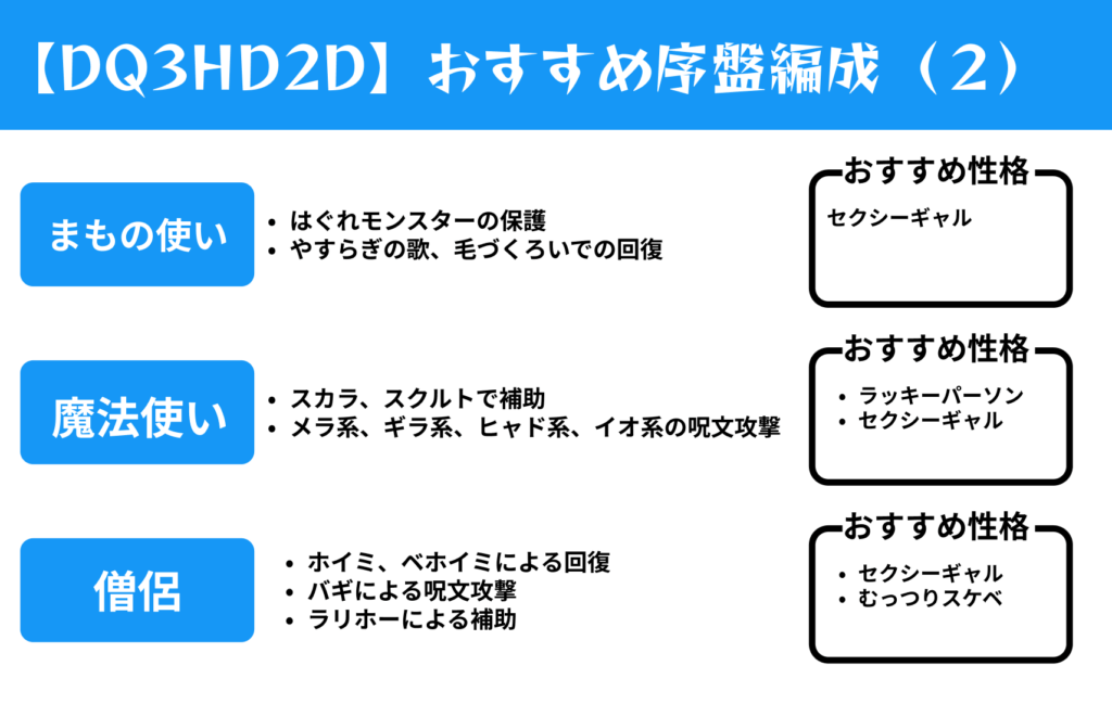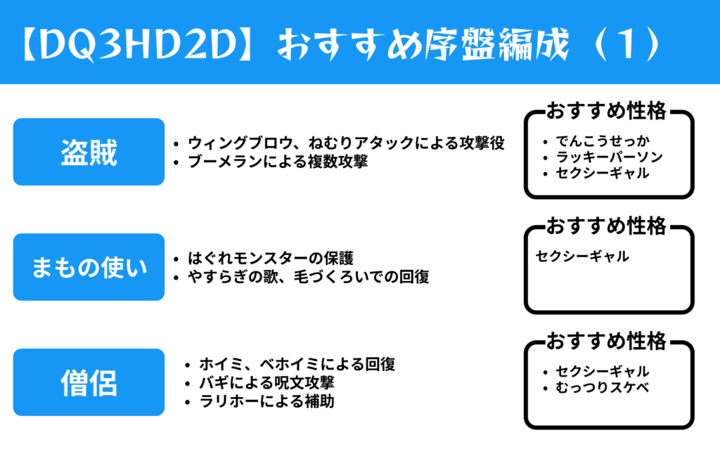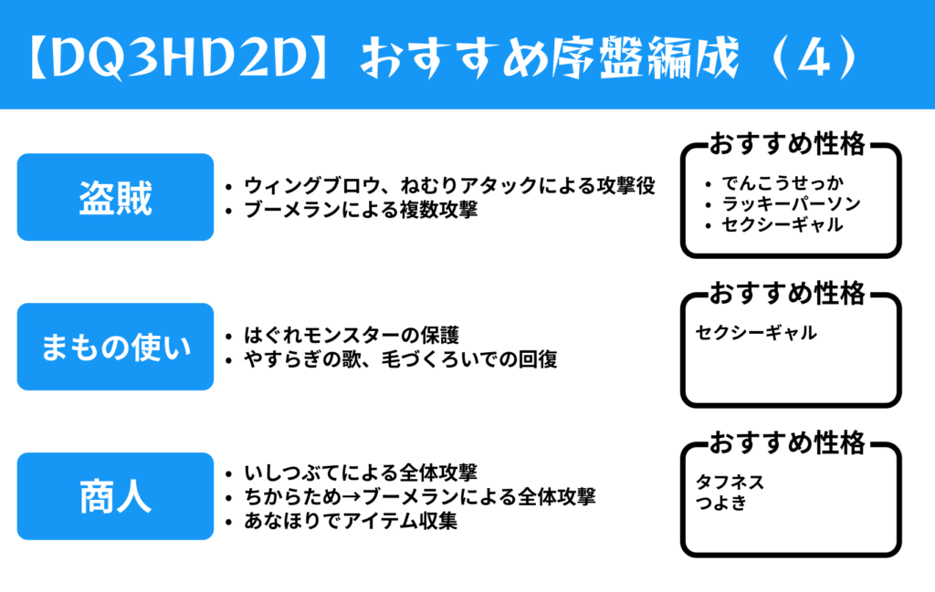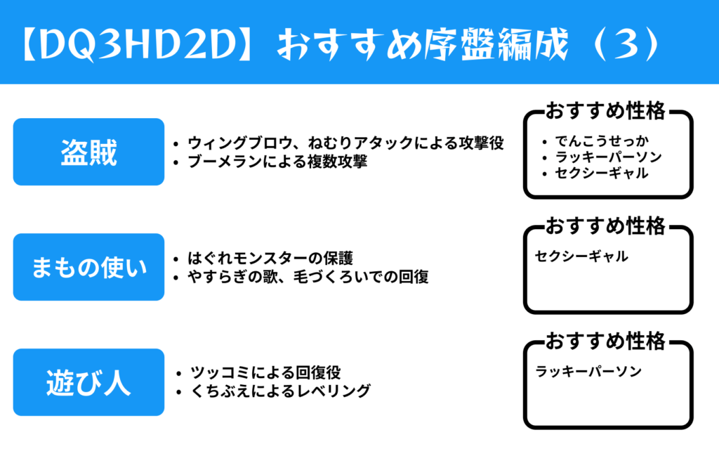 ただ、遊び人は戦闘中に一定の確率でこちらの命令を無視して勝手に遊ぶのでこちらの編成は上級者向けです。遊び人はLv20に到達したら賢者に転職しましょう。