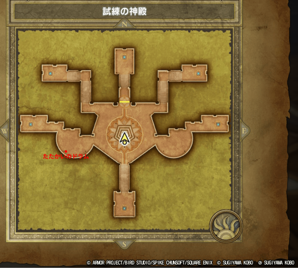 しんりゅうを規定ターン以内で倒すと叶えてもらえる願い事のうち、空欄を選ぶと試練の神殿が出現します。本作2つ目の隠しダンジョンで、ムオルからラーミアに乗って南東に向かうと試練の神殿に到達できます。